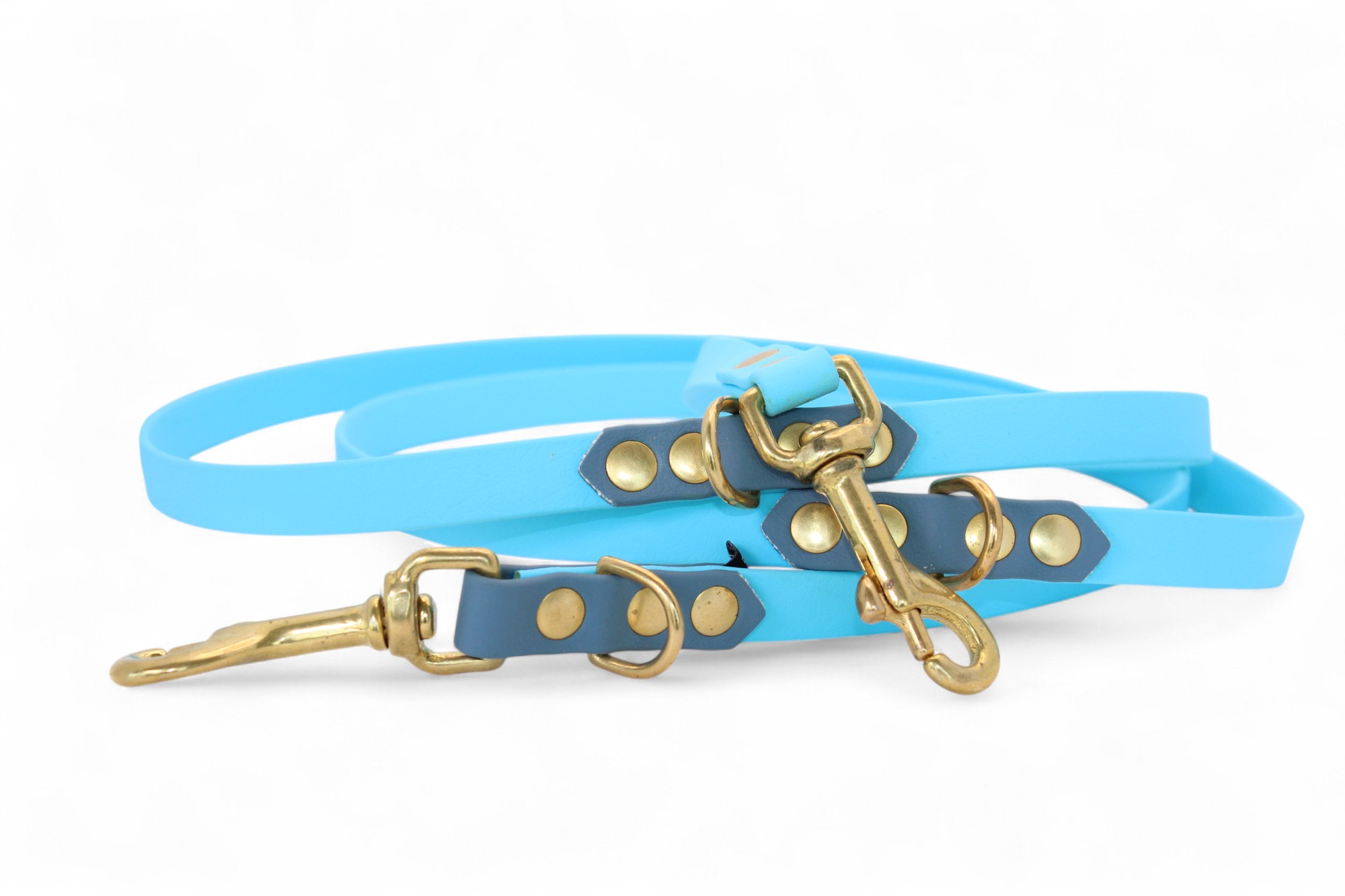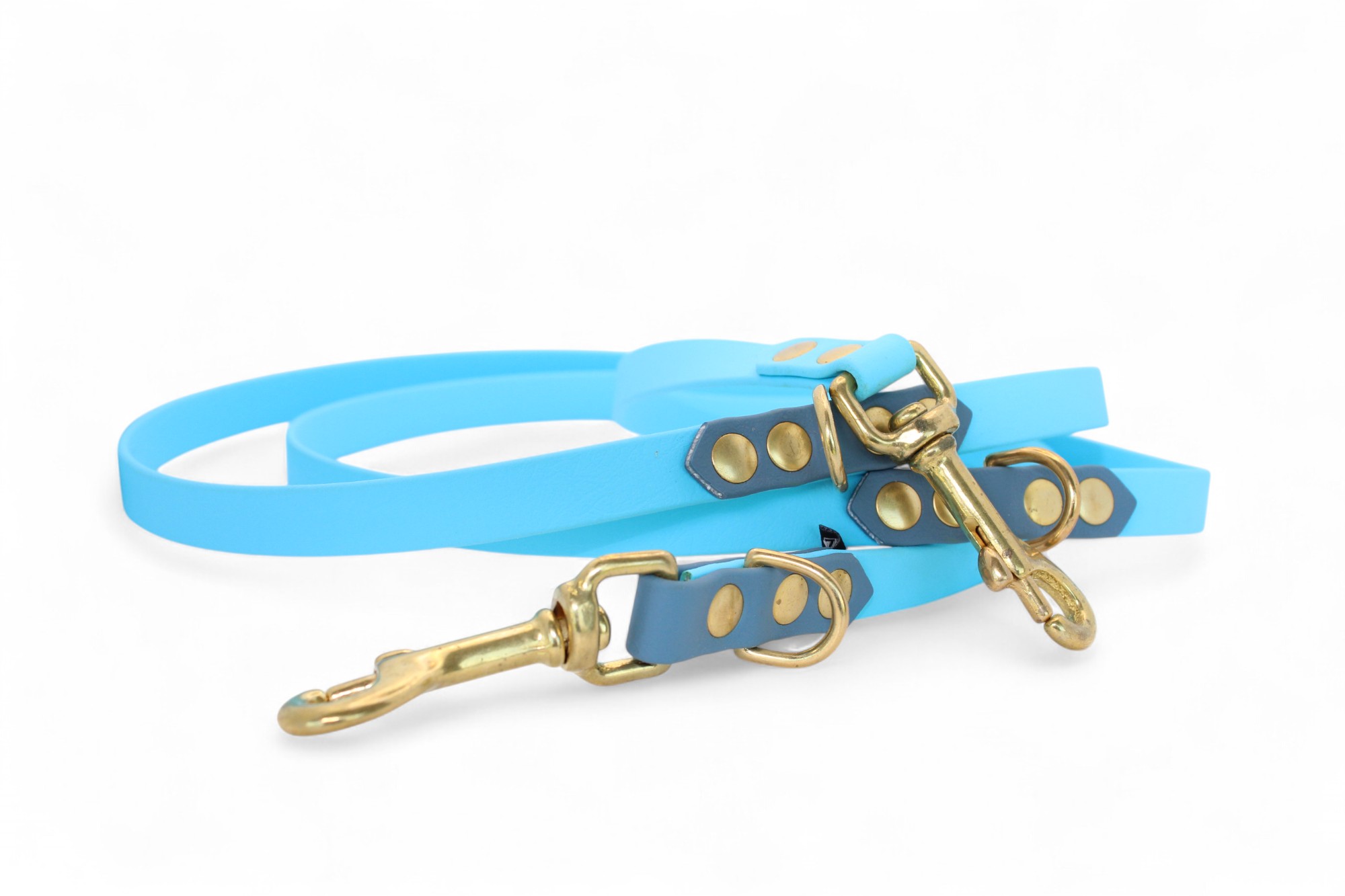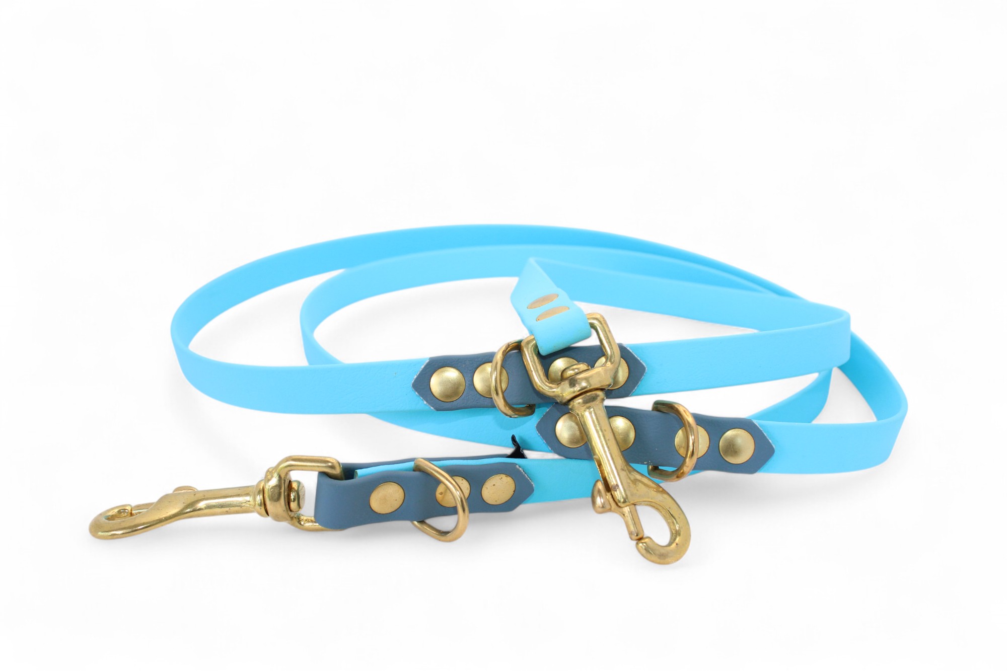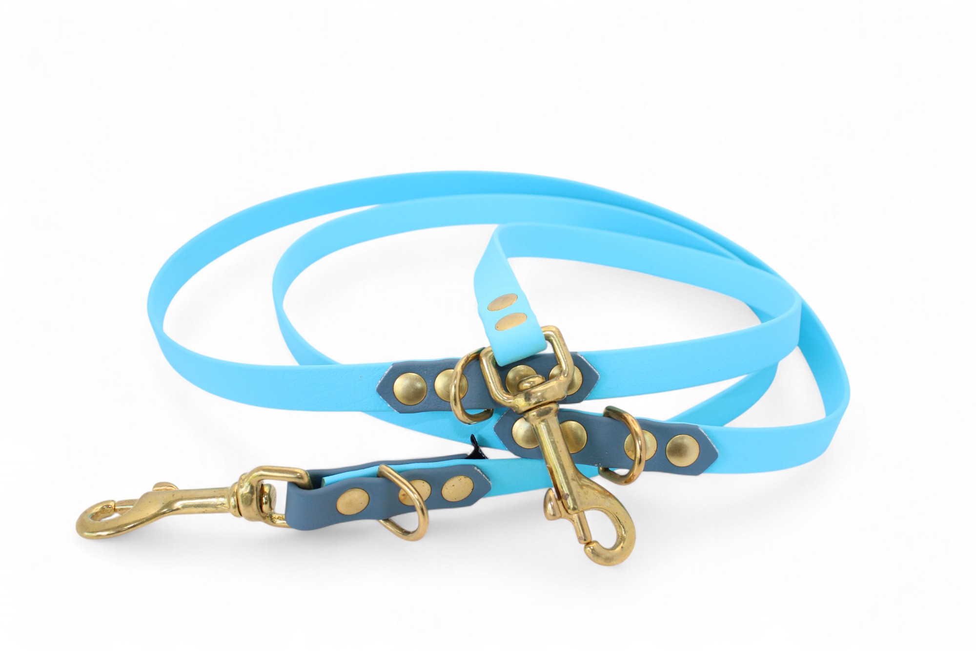 LAGERABVERKAUF: ACC Biothane® Multi-Clip Hundeleine 165 cm / 16 mm – Babyblau mit Jeans mit Messingbeschlägen