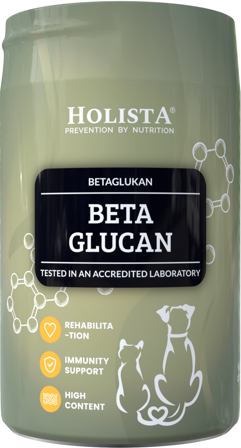Complément alimentaire en poudre pour chiens et chats, contenant des β-glucanes de haute pureté, isolés des parois cellulaires de la levure Saccharomyces cerevisiae.