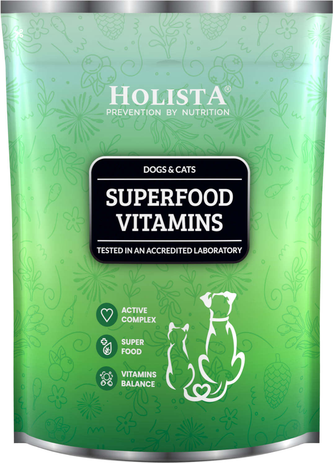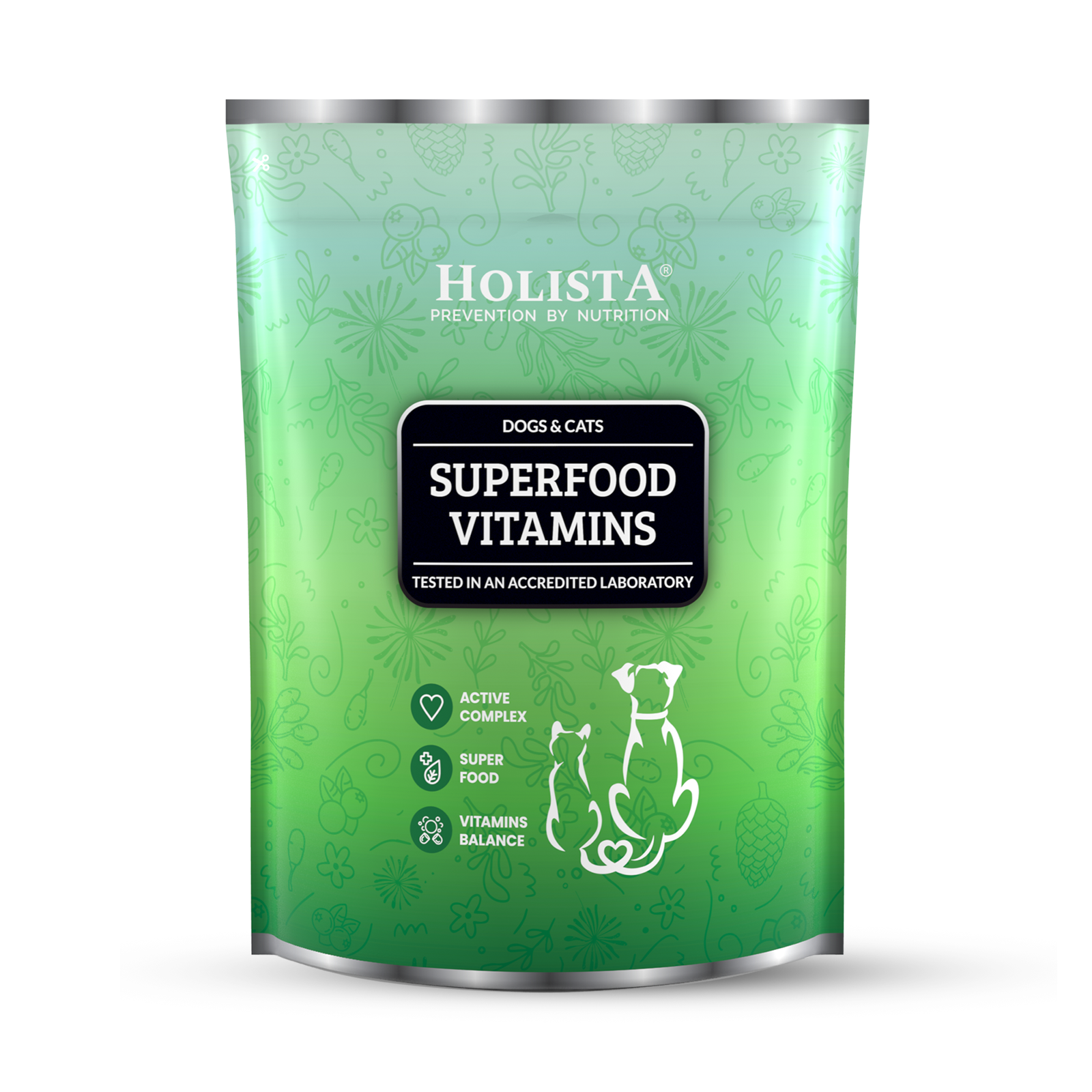 Superfood Vitamins est un complément vitaminé et minéral naturel destiné aux chiens et chats adultes. Il contient des vitamines soigneusement sélectionnées telles que A, D3, E, celles du groupe B, la biotine, l’acide folique, ainsi que des minéraux essentiels comme le zinc, le cuivre, le magnésium, le manganèse et le molybdène. Cette formule complète est enrichie d’un mélange exclusif de superaliments nutraceutiques pour prévenir les carences, soutenir le métabolisme, renforcer le système immunitaire et favoriser une peau saine et un pelage brillant.