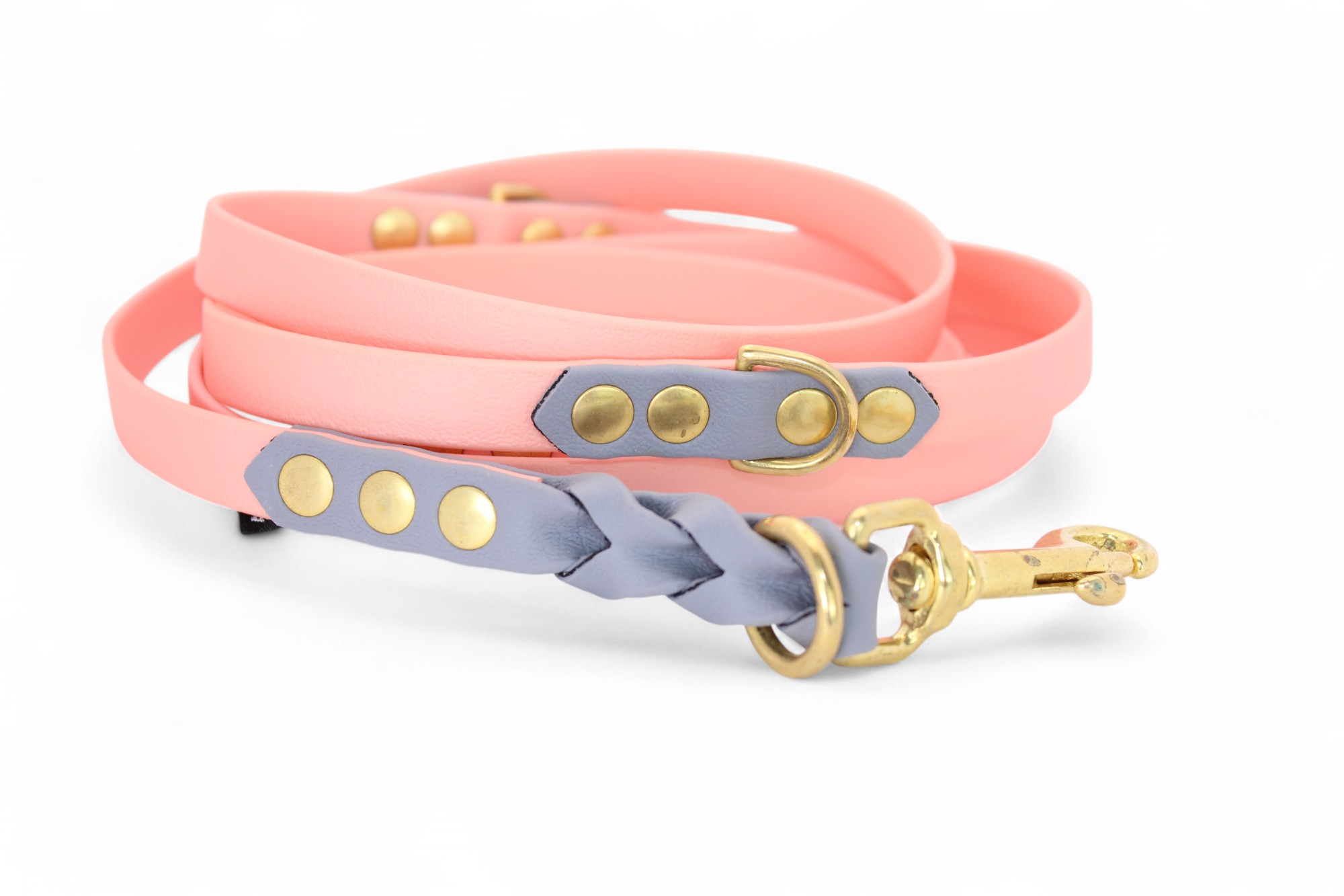 LIQUIDATION DE STOCK : Laisse multi-clip ACC Biothane® 165 cm / 16 mm – rose saumon avec tressage gris et finitions en laiton