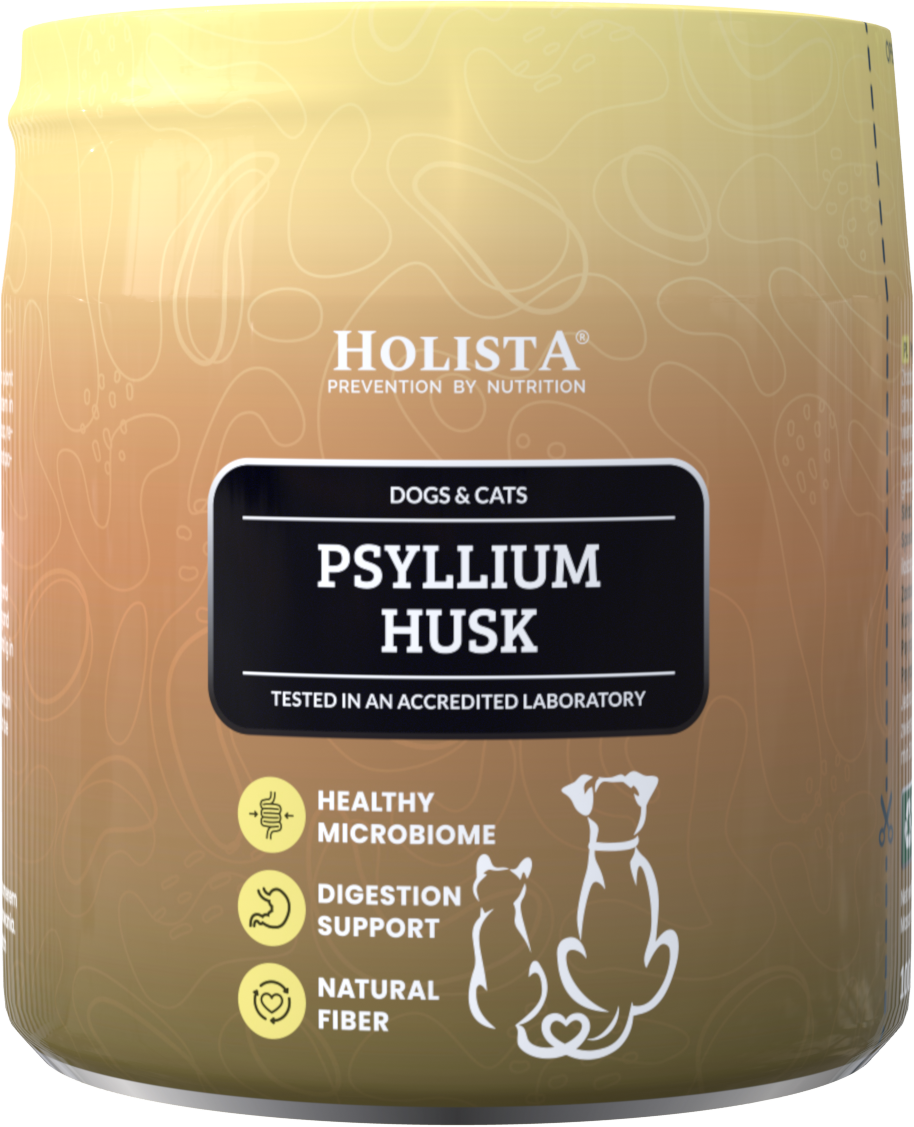 Psyllium husk (Plantago psyllium) is a natural source of soluble fiber obtained from the seed husks of the Asian plant Plantago. It supports the proper functioning of the digestive system in dogs and cats, helps regenerate the intestinal mucosa, and regulates food transit — eliminating problems related to constipation and anal gland issues.